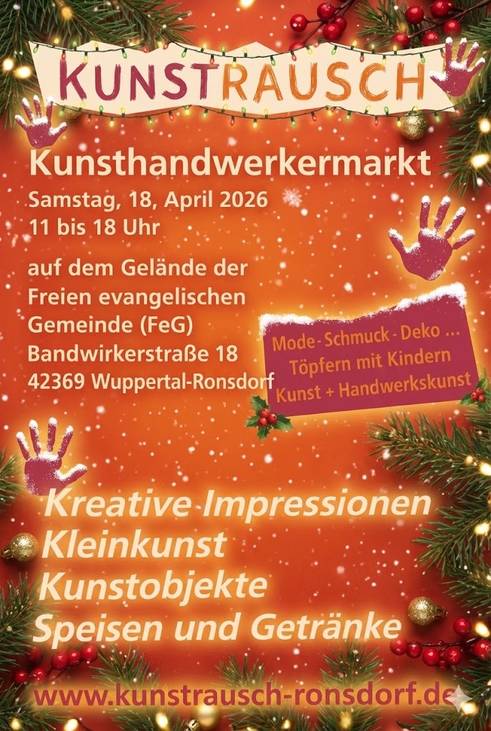 „Der beliebte Kunsthandwerkermarkt Kunstrausch macht sich bereit für ein neues Kapitel! Am 18. April 2026 zieht der Markt zum ersten Mal in die modernen Räumlichkeiten der Freien evangelischen Gemeinde (FeG) Wuppertal-Ronsdorf) in der Bandwirkerstraße 18. Das Organisationsteam freut sich riesig über diese Kooperation – ein echter Gewinn für alle Beteiligten.“